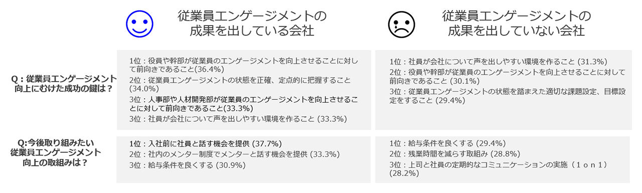 従業員エンゲージメントの取組み成果が出ている企業と出ていない企業には様々な点(KSFや今後の展望等)で相違が浮き彫りに