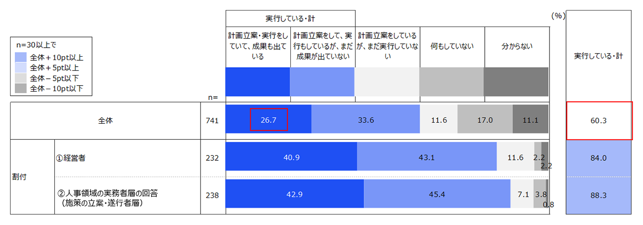 ・一方、従業員エンゲージメント向上の取組みを、計画・遂行するも成果を実感している企業は3割未満(26.7%)