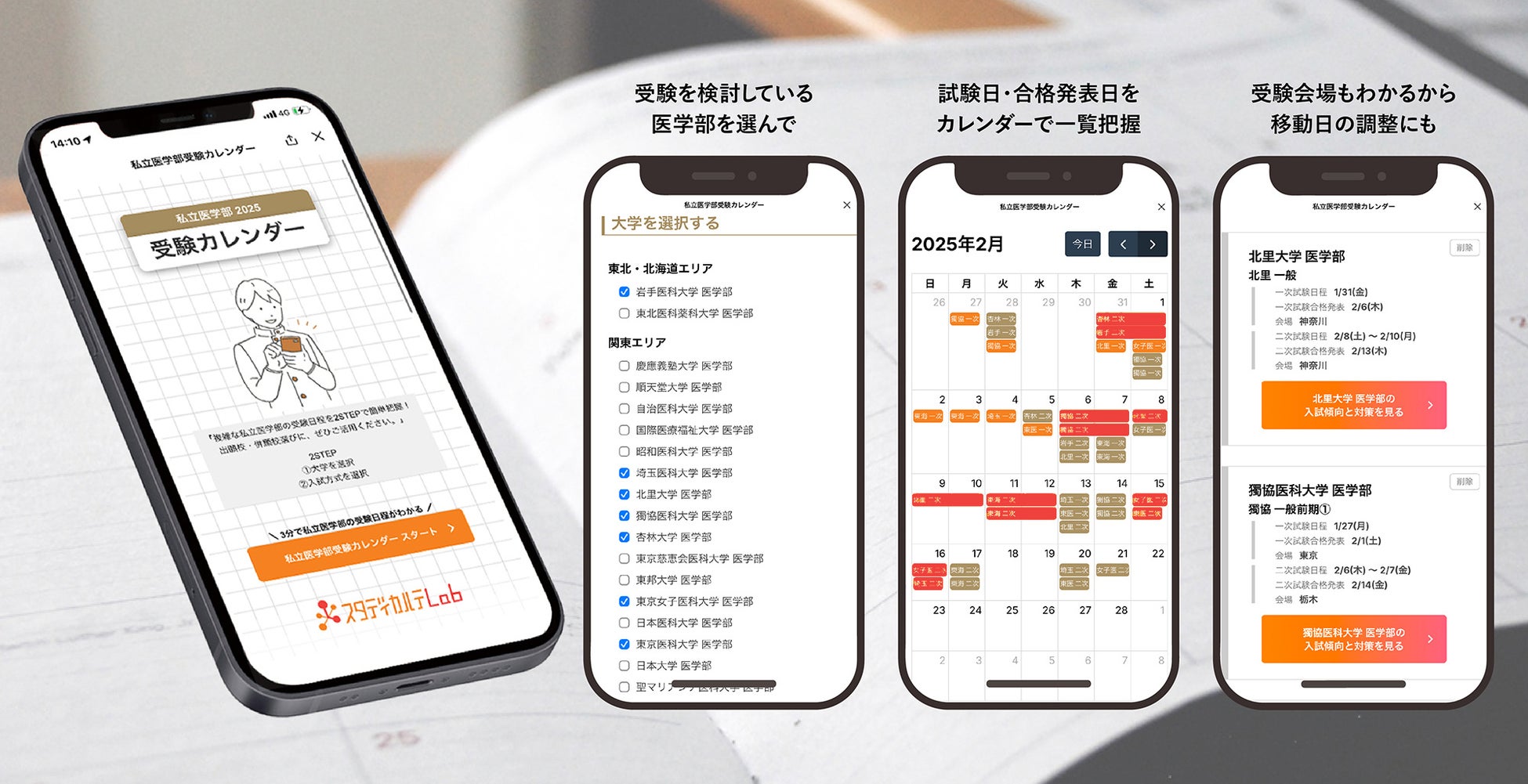 医学部完全特化型オンライン個別指導塾「スタディカルテLab」を運営する株式会社スタディカルテ(本社:東京都千代田区、代表取締役:樋口雅範)は、2024年12月9日、『私立医学部 受験カレンダー』をリリースしました。複雑な私立医学部の試験日程をスマートフォン上で簡単に把握できる、無料ツールです。