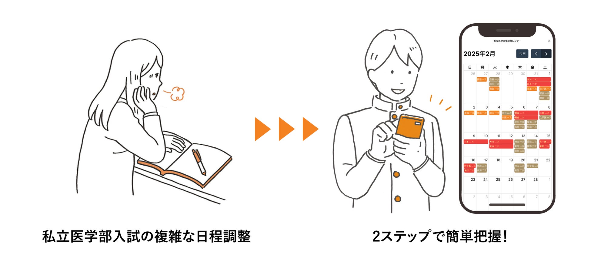 上記の背景を踏まえ、「もっとスマートに」「もっと簡単に」私立医学部の試験日程について把握し調整できることを目指して開発を進めたのが、今回リリースした『私立医学部 受験カレンダー』です。スマートフォン上の簡単な2ステップで、試験日や合格発表日を一覧で確認・整理できます。