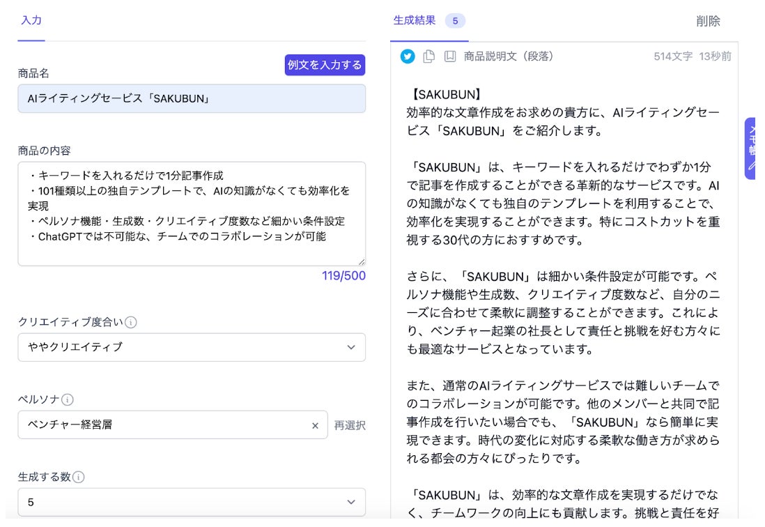 4、 ペルソナ機能・生成数・クリエイティブ度数など細かい条件設定で、より刺さる文章を。