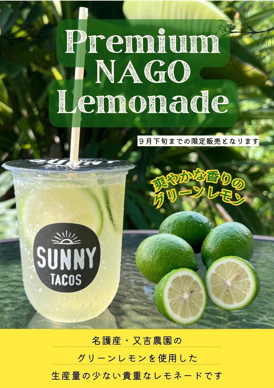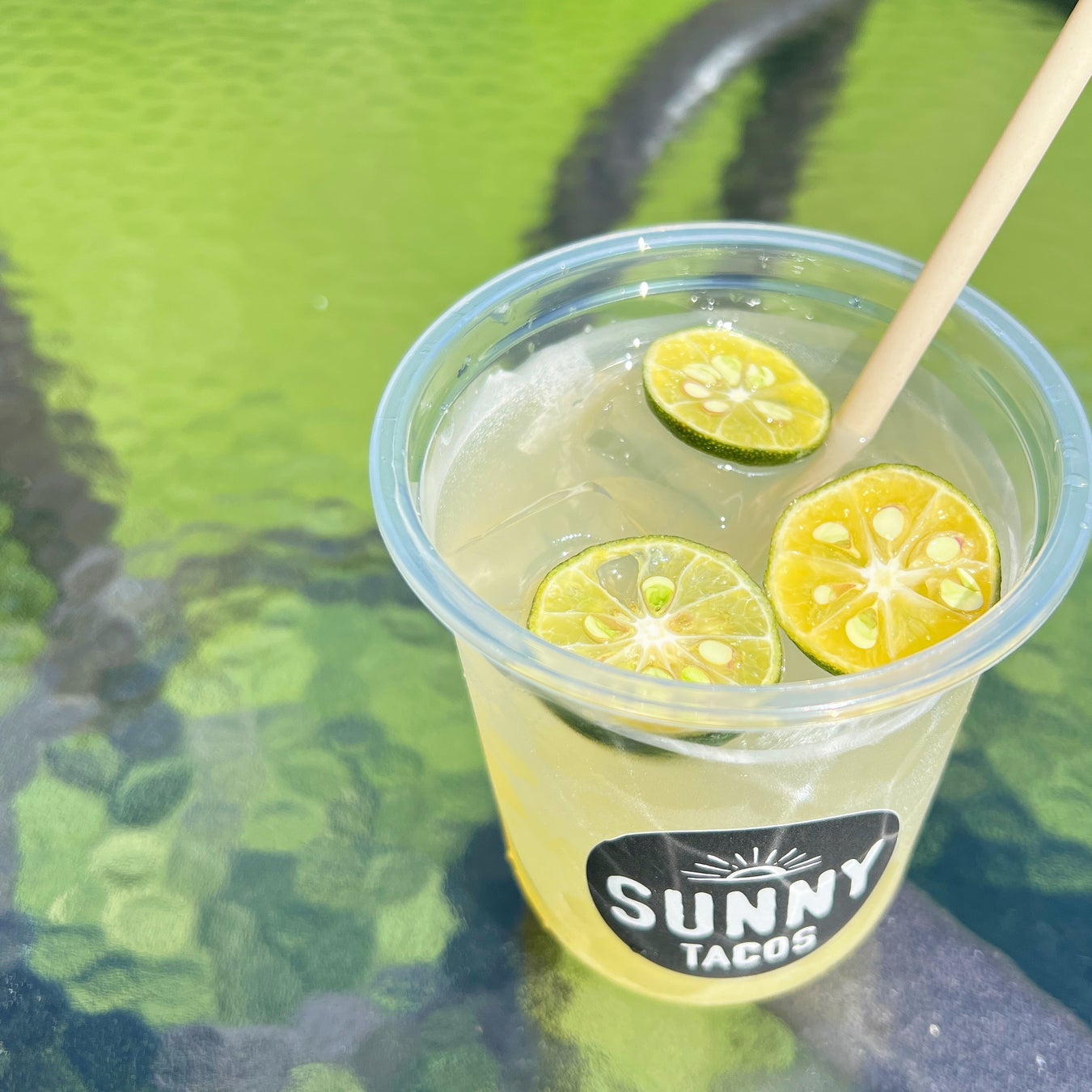 名護市の又吉農園が生産する希少な柑橘類「グリーンレモン」と契約し、サニータコスのレモネードが期間限定のバージョンアップ!生産量が少なく希少なグリーンレモンは、通常のレモンよりも酸味を抑えた爽やかな香りが特徴です。9月下旬までの限定販売となります。