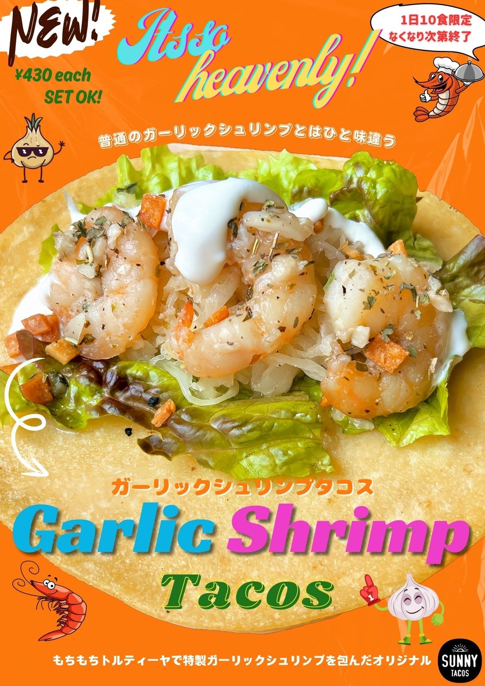 季節のタコス、2024年夏はみんな大好き「ガーリックシュリンプタコス」。たっぷりのニンニクで焼き上げたガーリックシュリンプは、サニータコスのトルティーヤに包むことで完成するオリジナルレシピのタコス!ニンニクの量が半端なく、パンチのある「ガーリックシュリンプタコス」です!ビールと一緒にはもちろん最高!レモネードとの相性もバッチリです。