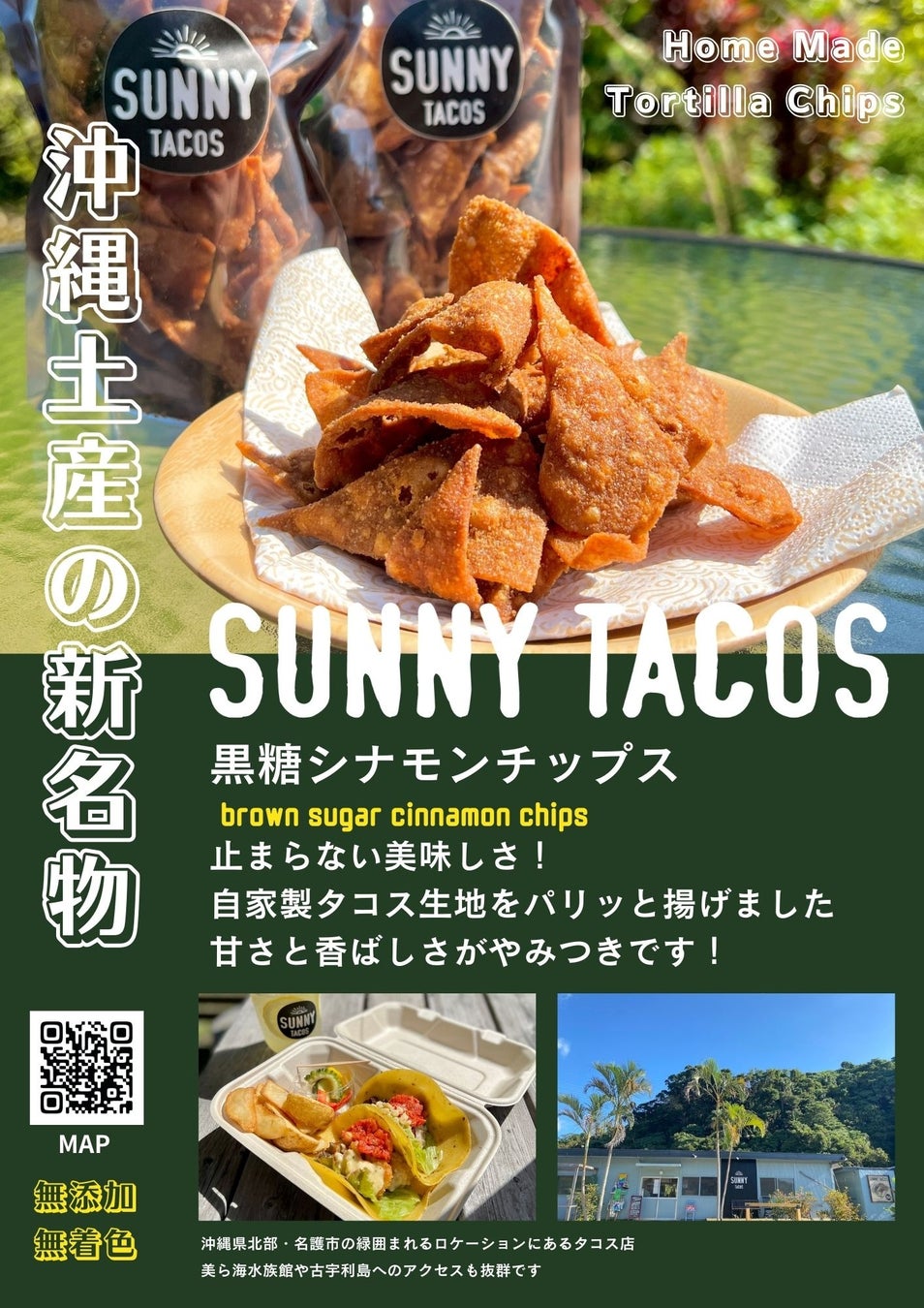 そのイベントに、サニータコスが出店します!もちもち生地のソフトシェルのタコスに、沖縄県外では買うことのできない「黒糖シナモンチップス」も販売します!