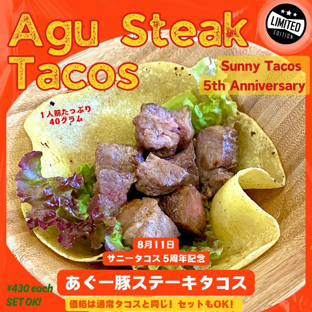 5周年の感謝を込めて8月11日(日)限定で企画した「あぐー豚ステーキタコス」はお陰様で大好評をいただきました。高級食材のため通常のタコスメニューでは提供が難しい商品ですが、終了後も多くのお問合せをいただき、召し上がることができなかったお客様のご期待に応えるべく、以下の日程で再度、限定販売いたします。
