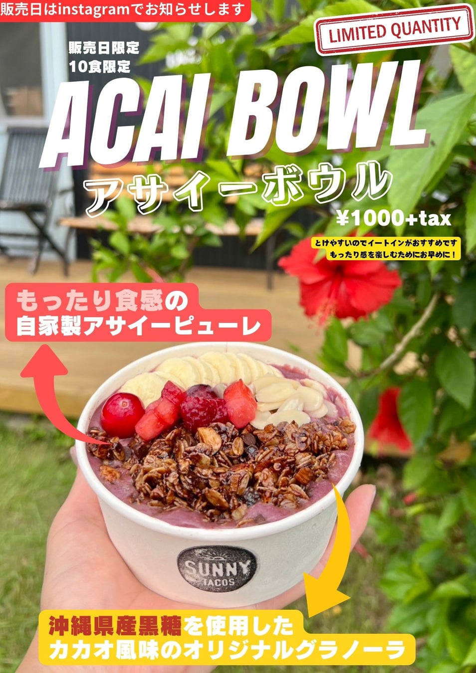 アサイーボウルを愛してやまない、サニータコスの学生女子スタッフがプロデュースした「アサイーボウル」がついに登場!沖縄県内、東京の人気店も食べ歩き、サニータコスらしいオリジナルアサイーボウルを開発しました。