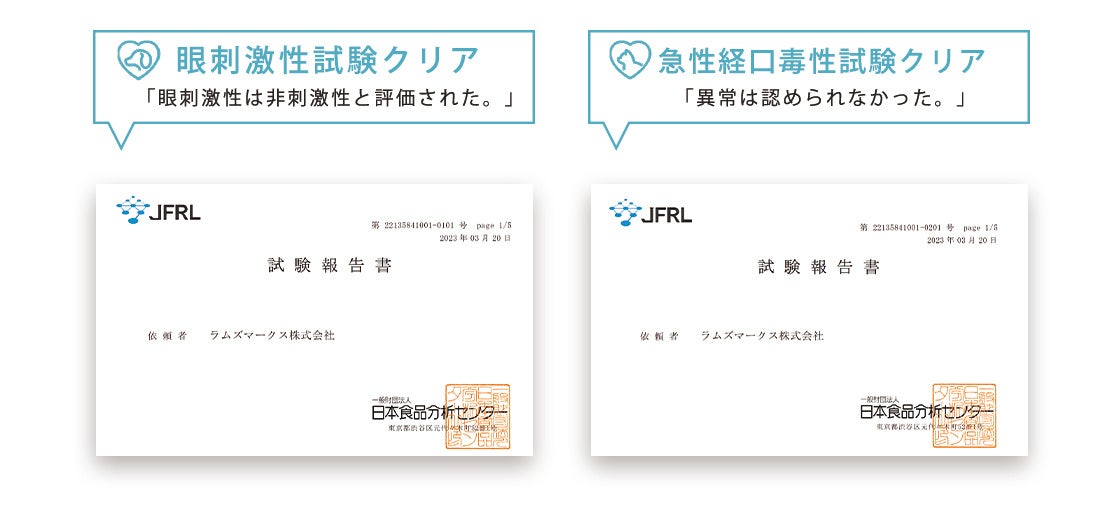 眼刺激試験、急性毒性試験ともに安全値をクリア。