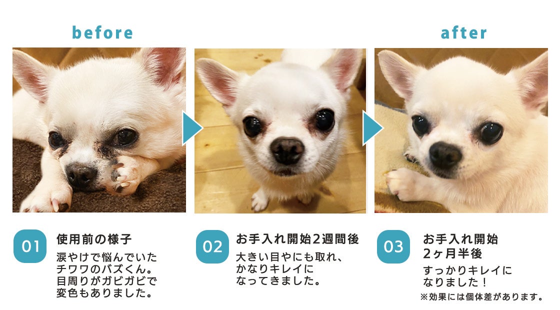 他の除去剤では、汚れは落ちても沁みるようで愛犬が痛がり可哀想でした。痛みを怖がる愛犬の姿と、ケア後の乾燥も悪化原因なのでは?という疑問から着想を得て「うるおう涙やけケア」をコンセプトに「フコロジーナミダケア」を開発するに至りました。本商品を活用したところ愛犬もケアを嫌がらないです。毎日安心して使用できるので変色部分もかなり綺麗になりました。」