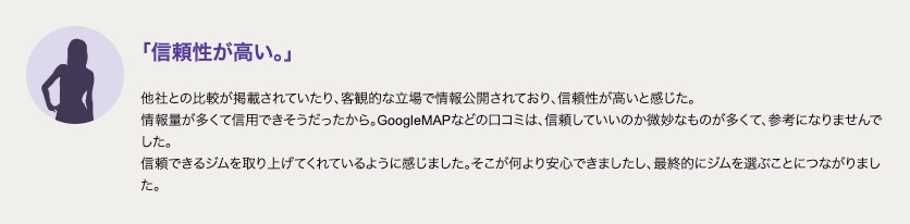 2018年9月末にGetfitをオープンしてから既に日本全国の多くのお客様からお問い合わせをいただいていますが、各地域に様々な規模・種類のパーソナルジムが存在する中で、「自分の目的にあったパーソナルトレーニングジムが分からない」というお声を多く頂戴しております。その中で、実際にGetfitでご相談させていただいたお客様からは、「他の媒体とも比べて、Getfitは情報量が多く自分の知りたい情報が掲載されていた」といった声が多数存在し、「Getfitで複数のパーソナルトレーニングジムを比較検討する中で自分にピッタリのパーソナルトレーニングジムが見つかった」というお言葉も頂戴しております。