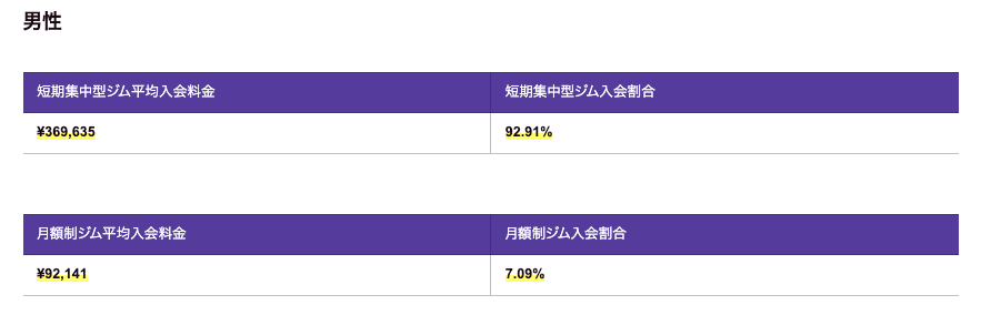 男女ともに短期集中型ジムへの入会割合が高く、その中でも男性は女性よりも約7万円以上高いコースを初回で契約していることがわかりました。