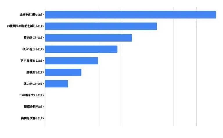 男女ともに1位、2位は「全体的に痩せたい」「お腹周りの脂肪を落としたい」というダイエット目的が結果として出ましたが、3位は男性の回答が「筋肉をつけたい」という回答に対して、女性の回答は「くびれをつけたい」「下半身痩せをしたい」など見た目に関する目的でそれぞれランクインしました。