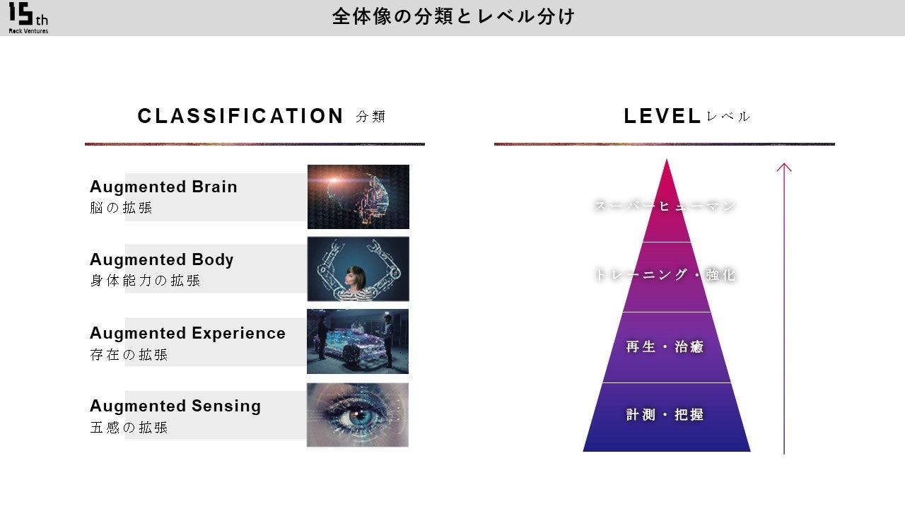 15th Rock Venturesは、投資領域をHuman Augmentation (人間拡張)とITに定め、投資活動を行っているベンチャーキャピタルです。Human Augmentationとは、身体能力を向上させることで、これまで不可能であった様々なスキル習得を可能にすることです。弊社はHuman Augmentationへの投資を通じて、人生における選択肢を増やし、人生100年時代の豊かな社会を実現することを目指します。