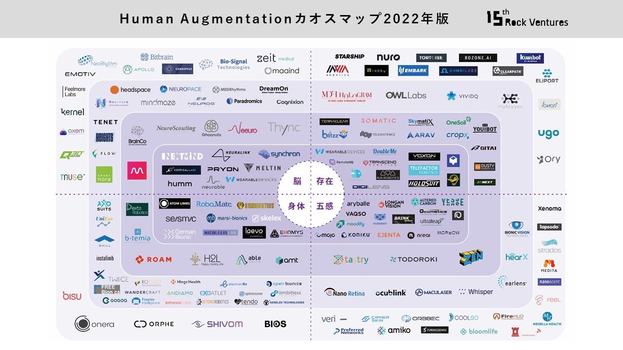 Human Augmentationを投資主題に掲げる15th Rock Venturesは、世界各国のHuman Augmentation関連のスタートアップをまとめた2022年版のカオスマップを公開しました