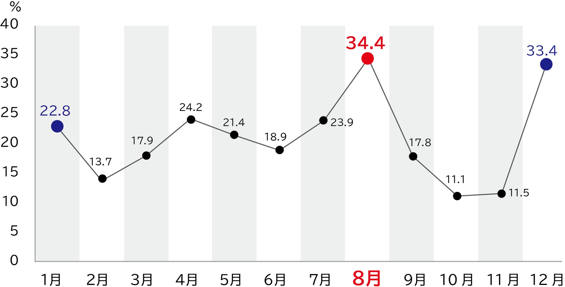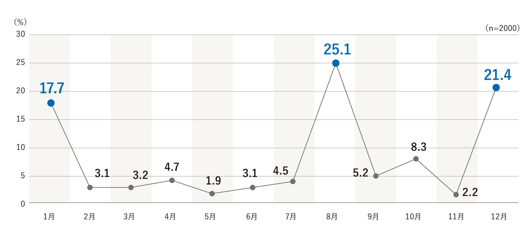 ●1年のうち、最も胃の不調を感じる時期は「8月」