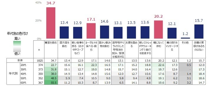 慢性的な胃の不調を感じている人に、胃の不調が起きたときの対処で効果を実感したものを聞くと、最も多かったのは「胃薬を飲む」で34.7%となりました。 次いで「横になって休む」(20.2%)、「ヨーグルトを食べる・飲む」(17.1%)が多くの回答を集めました。「胃薬を飲む」と答えた人を年代別にみてみると、年代が上がるごとに割合が高まる傾向にあり、40代で全体平均を上回る38.9%、50代で48.5%、60代では55.5%に達しました。