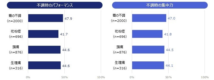 また、慢性的な胃の不調を感じている人は、仕事のパフォーマンスだけでなく、集中力も普段の半分以下に低下していることがわかりました。これは、一般的に生産性を低下させるといわれている花粉症や生理痛、頭痛と比べても引けを取らない数値であり、慢性的な胃の不調がパフォーマンスや集中力に大きな影響を及ぼしていることが浮き彫りになりました。
