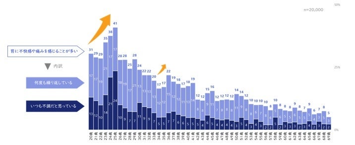 慢性的な胃の不調を感じる人は若年層に多く25歳でピーク |