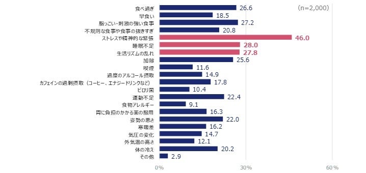 Q:あなたが感じたことのある、胃の不調の原因だと考えられるものをすべて教えてください。(複数回答可)(n=2,000)