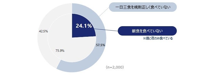 慢性的な胃の不調を感じている人に、食事のタイミングについて聞くと、一日三食(朝・昼・夜)を規則正しく食べていない人が過半数(57.5%)を占め、普段の食生活が乱れている可能性が示唆されました。また、 24.1% の人が「昼と夜のみ食べている」と回答しており、慢性的な胃の不調を感じている人の約4人に1人が朝食を抜いている実態が明らかになりました。