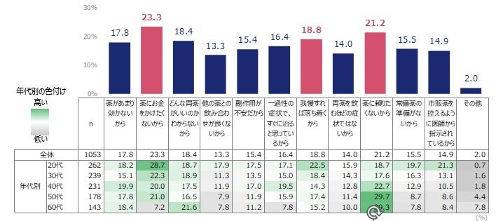 また、「薬があまり効かないから」(17.8%)も上位に入っており、胃薬を使っても効果が実感できない人が一定数いることもわかりました。年代別にみてみると、 「薬にお金をかけたくないから」は若年層で、 「薬に頼りたくない」は40代以降で割合が高まる傾向がみられました。