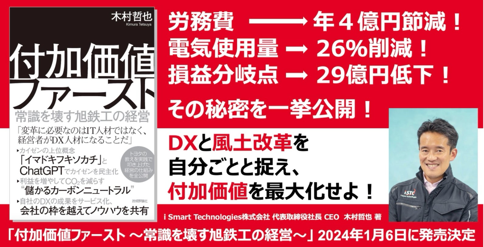 トヨタ系1次サプライヤー旭鉄工のDX を実現した IoT システムとノウハウを用いて、お客様の生産性向上と CO2 削減を実現する i Smart Technologies 株式会社(本社︓愛知県碧南市、代表取締役社⻑ CEO︓木村哲也、以下︓iSTC)は、代表・木村の書籍「付加価値ファースト〜常識を壊す旭鉄工の経営〜」が2024 年1 月6日に技術評論社より発売開始となることをお知らせします。