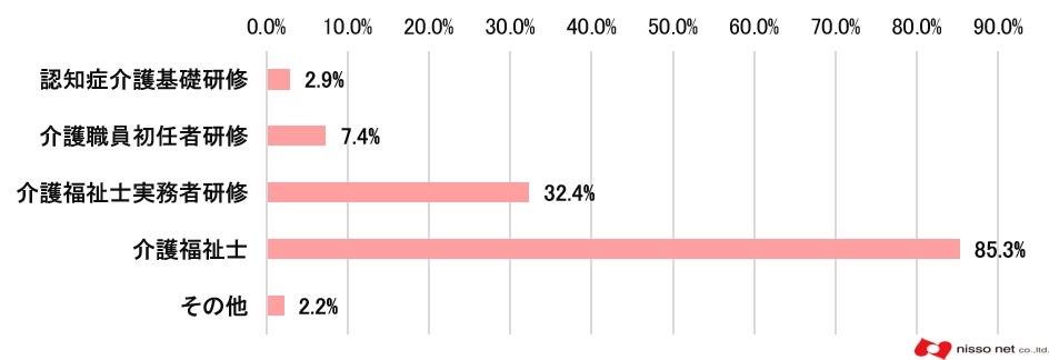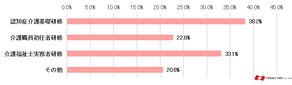 2024年4月から受講が義務化された「認知症介護基礎研修」が最も高く約4割(38.2%)、続いて「介護福祉士実務者研修」3割強(33.1%)、「介護職員初任者研修」2割強(22.8%)という順位となりました。