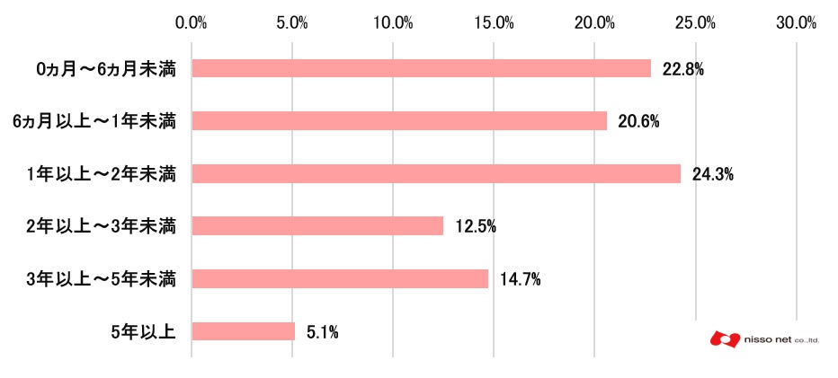 1年以上~2年未満が最も多く24.3%、次いで、0ヵ月~6ヵ月未満(22.8%)、6ヵ月以上~1年未満(20.6%)となりました。