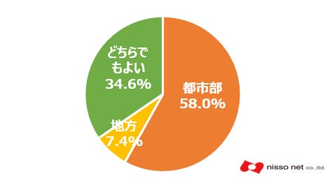 「都市部がよい」という回答が約6割(58.0%)となったものの、「どちらでもよい」という回答も3割以上(34.6%)あり、「地方がよい」(7.4%)と合計すると4割強(42.0%)となりました。