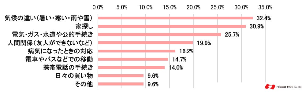 また、「家探し」(30.9%)や「公的手続き」(25.7%)なども、それぞれ高めの数値となっており、日常生活の基盤を築く部分で苦労をすることも多いことがうかがえます。