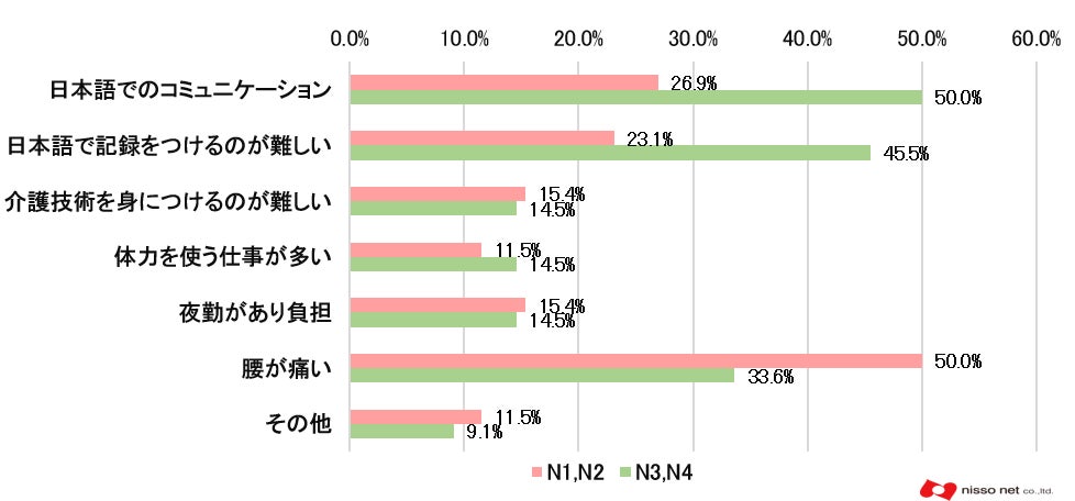 ※「日本語でのコミュニケーション」(45.6%)、「日本語での記録」(41.2%)、「腰痛」(36.8%)