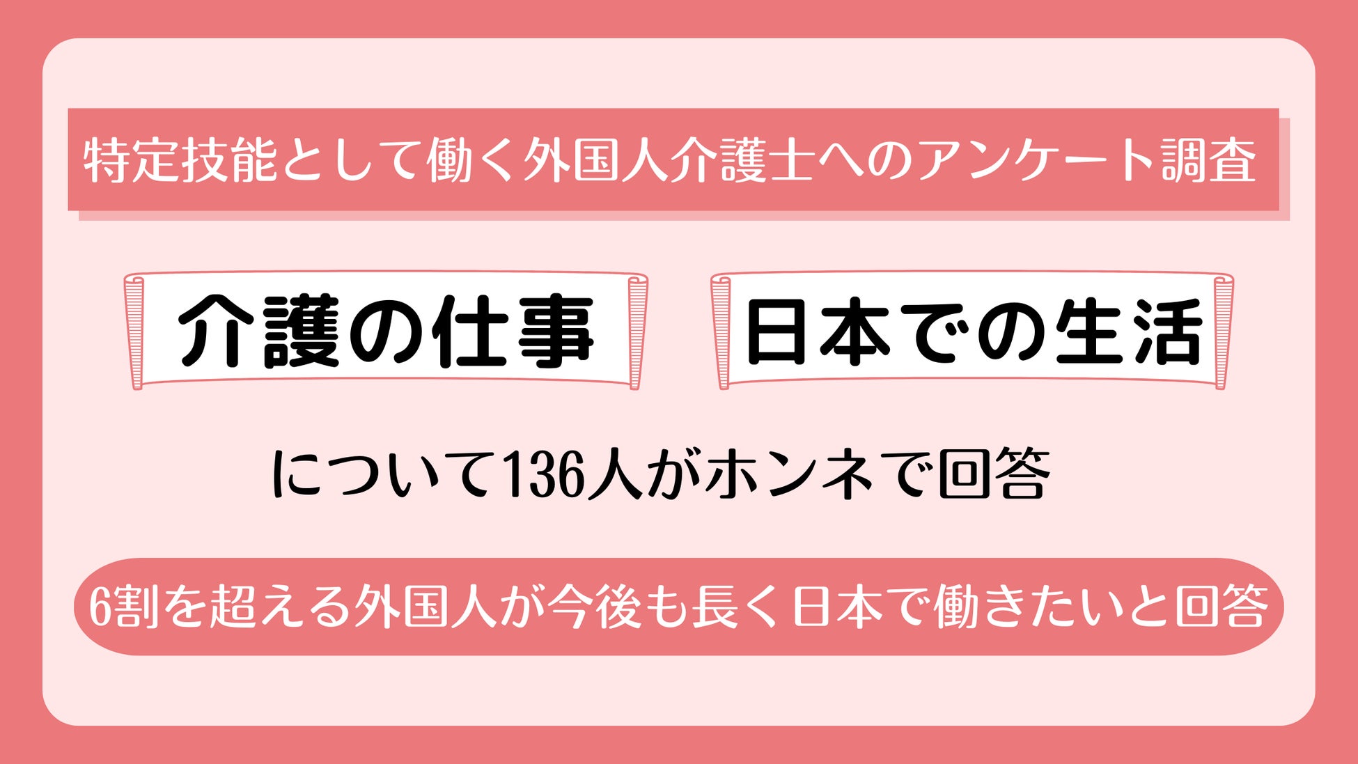 介護に特化した外国人就業支援を行う株式会社ニッソーネット(本社:大阪市北区、代表取締役社長:山下哲也)は、特定技能として働く外国人介護士を対象に、日本の魅力や働きたい期間、都市部と地方それぞれの良い点、日本で困っていることなど、外国人材の“ホンネ”をさぐるアンケート調査を実施しましたので、その結果をお知らせします。