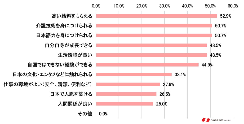 1位は「高い給料をもらえる」で52.9%、2位は「介護技術を身につけられる」と「日本語力を身につけられる」が同率(50.7%)で並び、次いで「自分自身の成長」と「生活環境」も同率(48.5%)となりました。