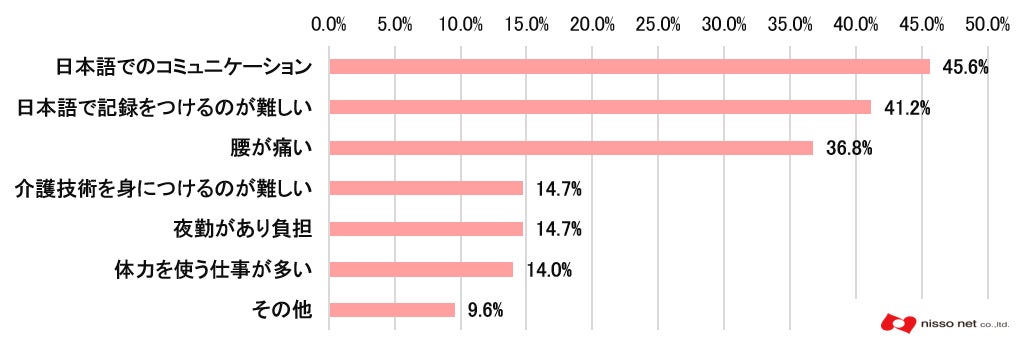 「日本語でのコミュニケーション」(45.6%)や「日本語での記録」(41.2%)など、日本語力が要因となるものが1位・2位を占めました。