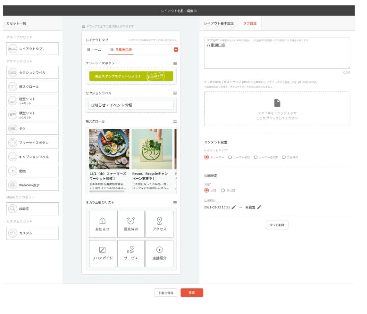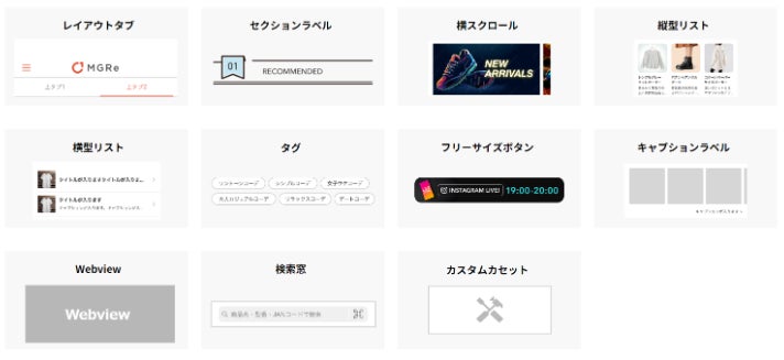 カセットレイアウト機能は、豊富なカセットから、ブランドにあったデザインを組み合わすことができ、オリジナリティーの高いアプリ画面を管理画面上(CMS)から簡単に作ることができるため、お客さまへタイムリーにパーソナライズされたコンテンツを届けることが可能になります。