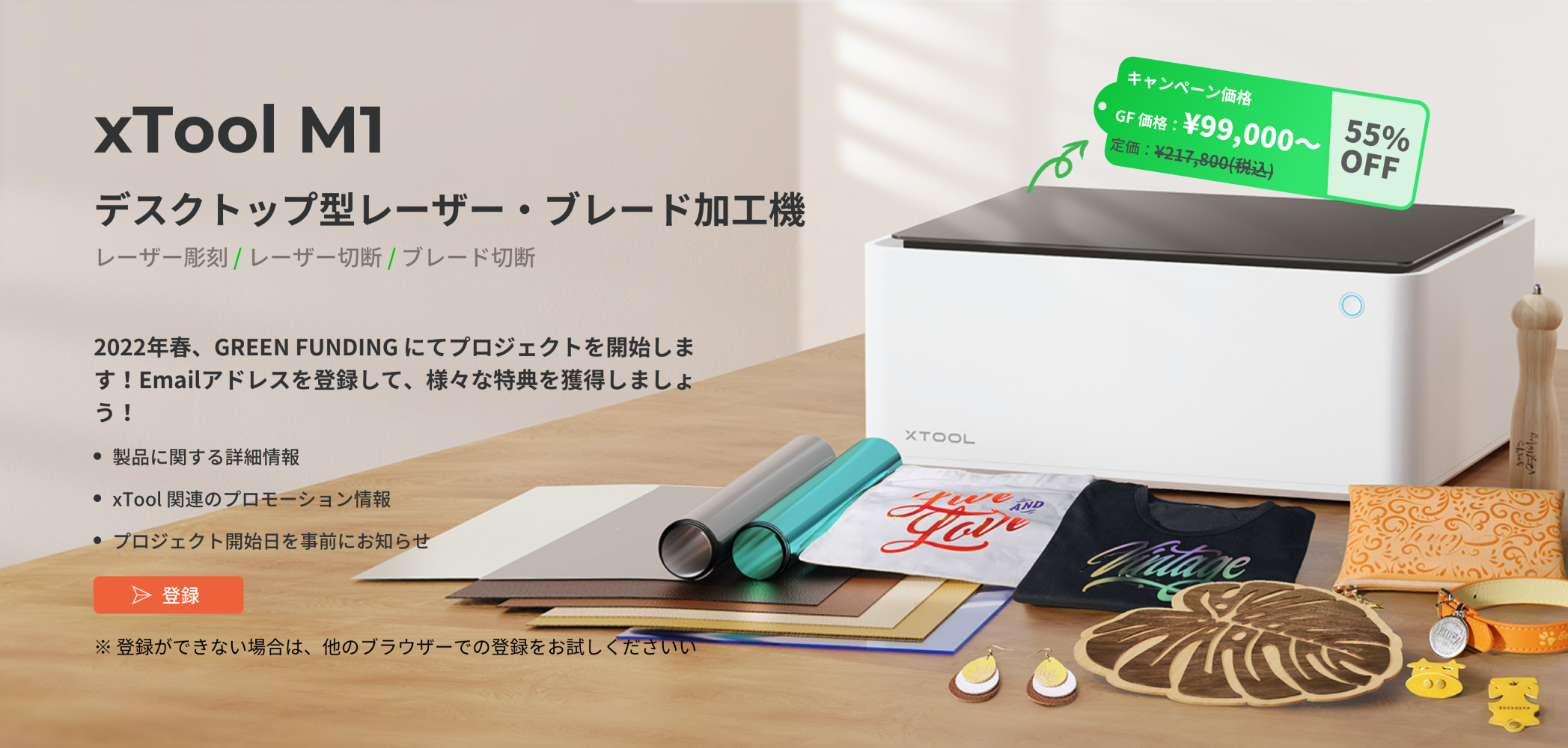 xTool M1 GREEN FUNDINGプロジェクト 事前登録ページ:https://jp.xtool.com/pages/cf-m1