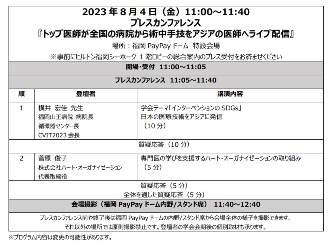 第31回日本心血管インターベンション治療学会学術集会(会長:横井宏佳)とライブ研究会プラットフォーム「e-casebook LIVE(イーケースブック・ライブ)」を運営する株式会社ハート・オーガナイゼーション(本社:大阪市淀川区、代表取締役:菅原俊子)は、「トップ医師が全国の病院から術中手技をアジアの医師へライブ配信」と題した記者発表会を、8月4日(金)11時より福岡PayPayドームで開催します。ライブ手術配信の様子や会場の様子を撮影することもできます。皆さまのご参加を心よりお待ち申し上げております。