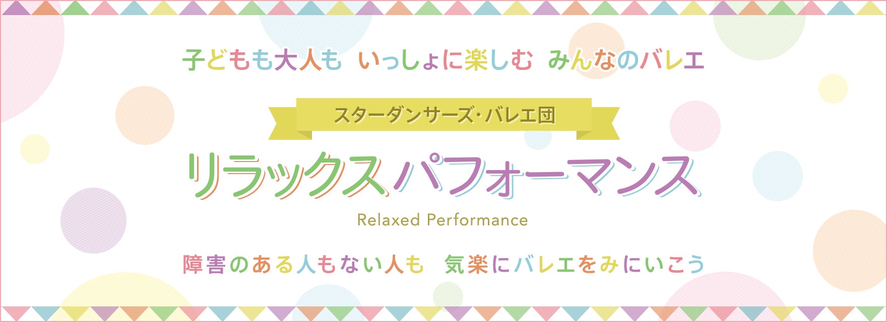 リラックスパフォーマンス(言語:Relaxed Performance)は、劇場空間での鑑賞に不安がある方のためにアレンジされた公演形態です。照明や音量レベルを調整して障害のある方にとっての感覚的な刺激をできるだけ排除する他、「上演中でも客席から出ることができる」「多少の話し声やざわつきを許容する雰囲気を醸成する」等、通常のバレエ公演の鑑賞マナーを緩和し、自閉症やADHDの症状などにより公演鑑賞機会が限られている方々や、バレエ鑑賞が初めての小さなお子様連れのご家族も、構えずにリラックスして鑑賞をお楽しみいただくことを趣旨としています。