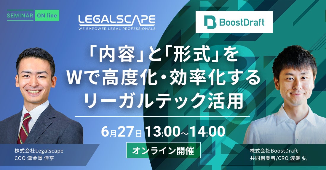 【6月27日(木)開催】LegalscapeとBoostDraftが「法務のアウトプットの高度化・効率化」をテーマにした無料セミナーを開催