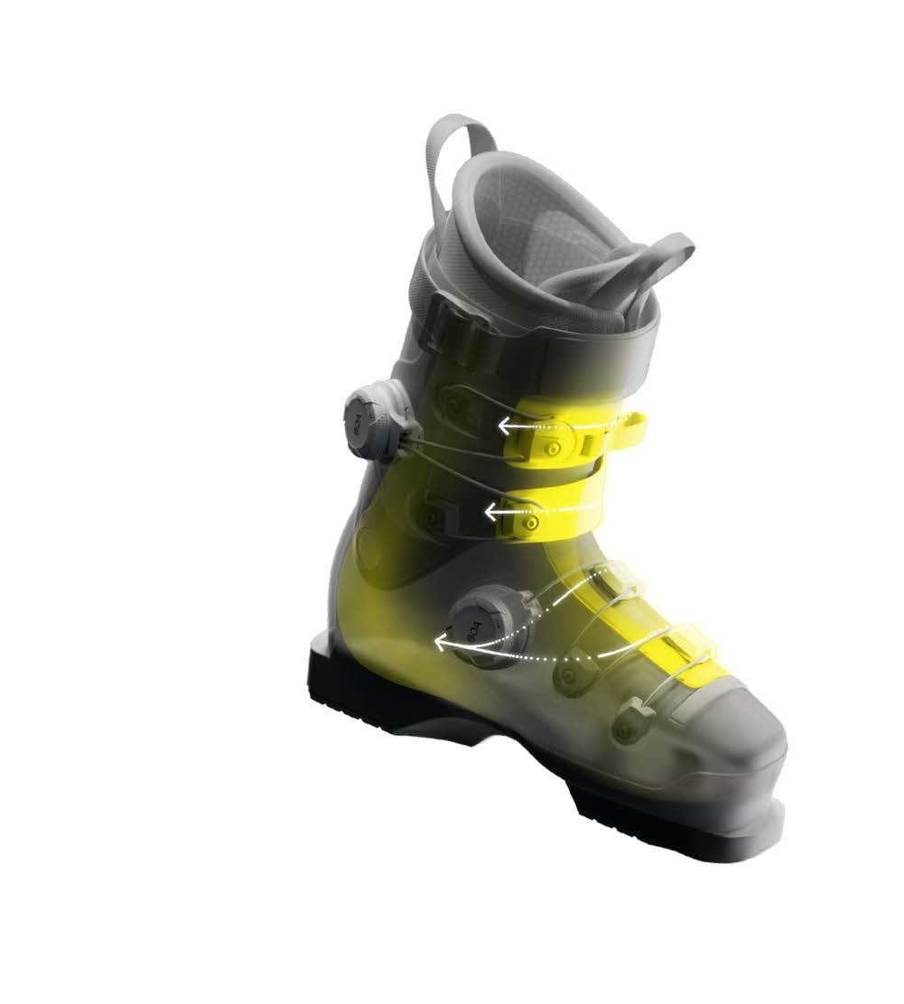 アルペンスキー用デュアルダイヤルBOA®フィットシステム。優れたフィットと実証されたパフォーマンス上の優位性。