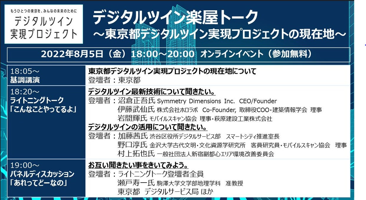 本プロジェクトの一環として、都民の皆様に「都市のデジタルツイン」を取巻く最新技術や参画プレイヤーの現在の興味関心について理解を深めていただくことを目的にオンライントークイベント「デジタルツイン楽屋トーク」を2022年8月5日(金)に開催します。