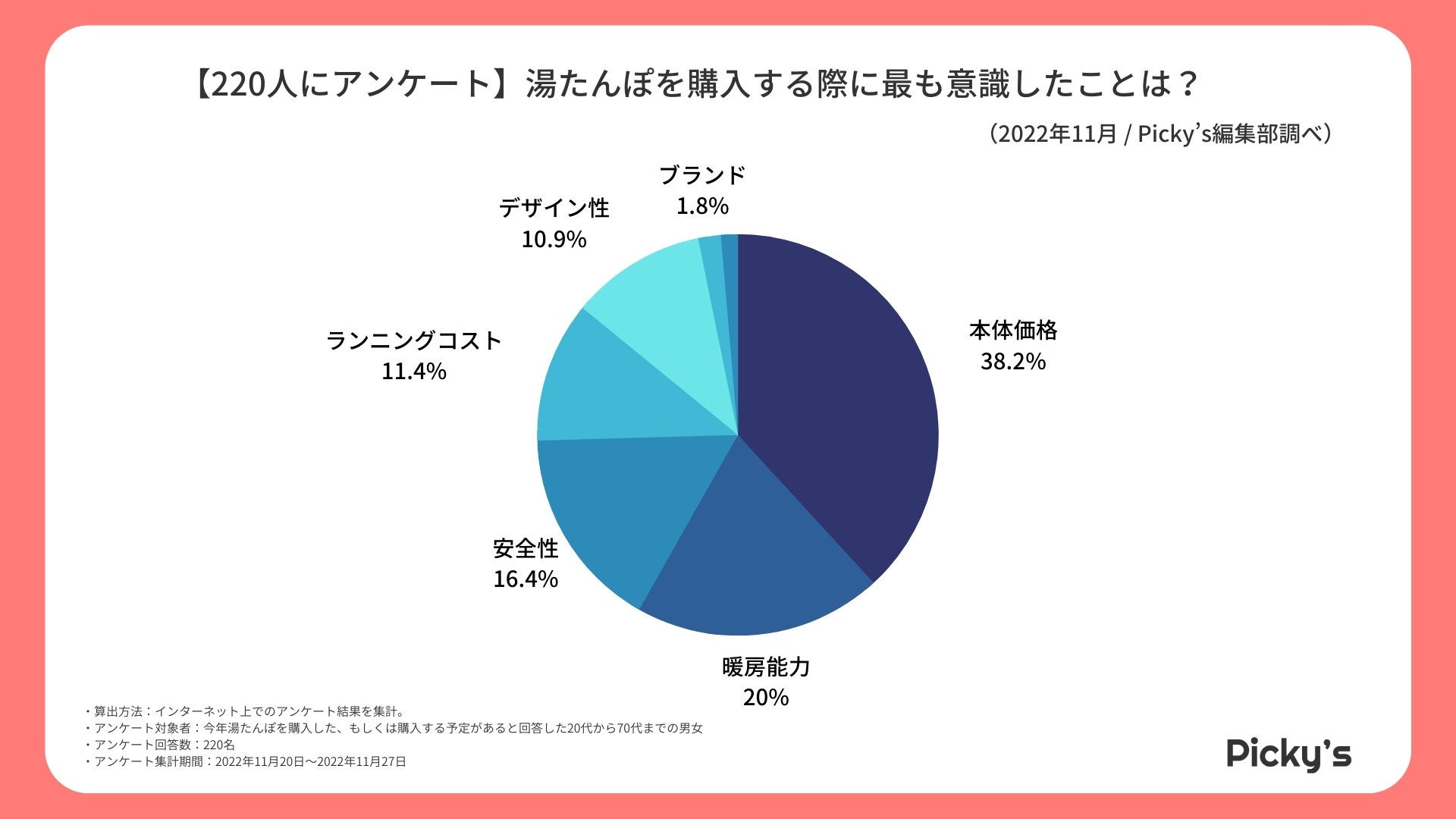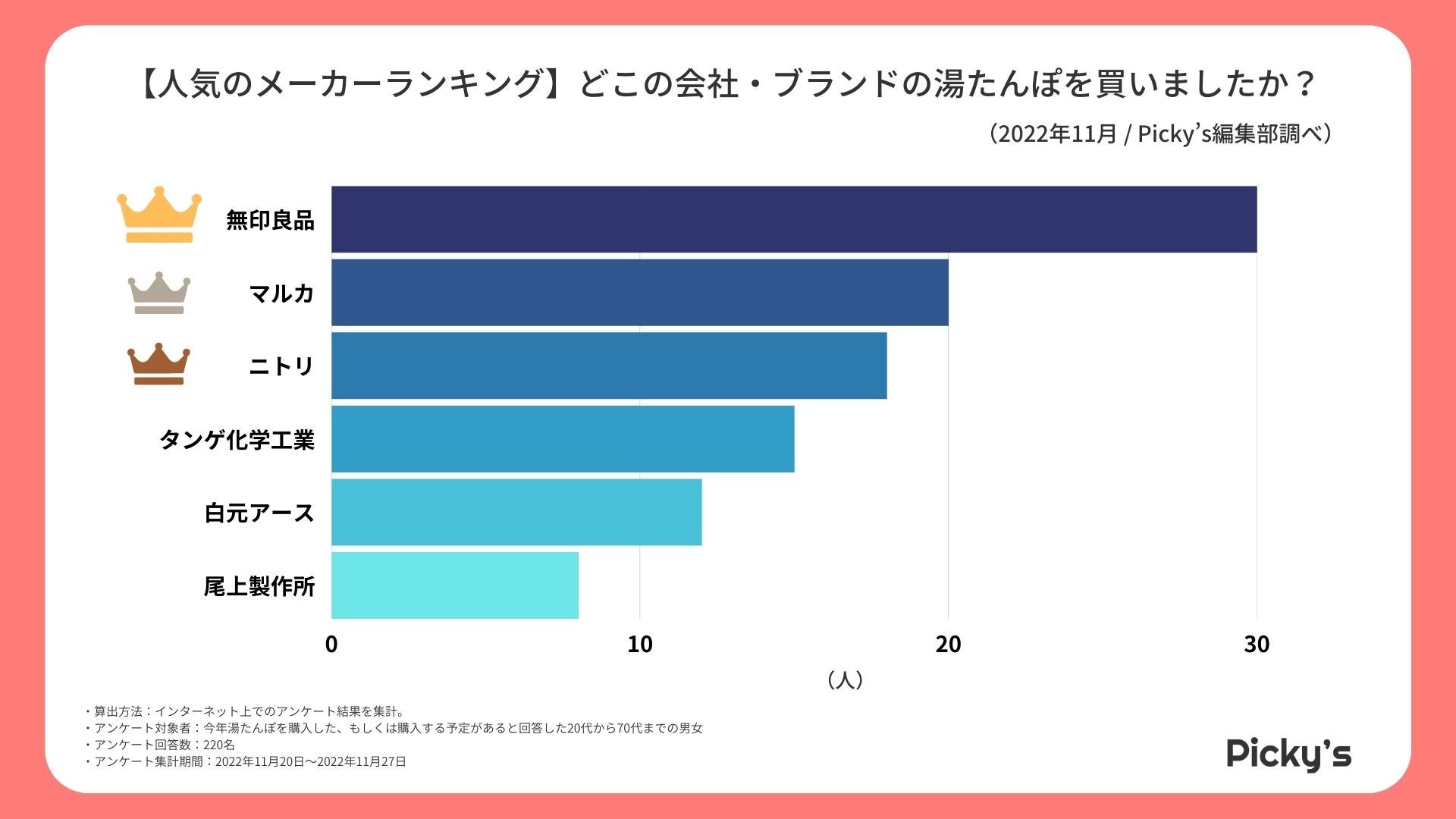 「Picky’s」は、インターネットショッピングにおいて、購入前に試せない・選ぶべきものがわからないという課題の解決を目標に、あらゆる商品のおすすめランキングや検証レビューを紹介するサイトです。このたびPicky’s(https://rentry.jp/note/)では、湯たんぽを買う際に意識していることや人気のメーカー・ブランドなどをインターネット上でアンケート調査を行い、ランキングを作成いたしましたので発表いたします。