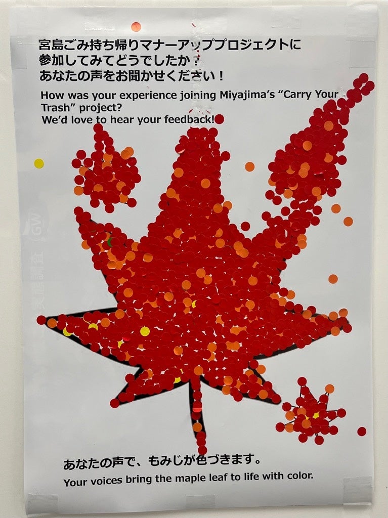 参加者からは、「テイクアウトのごみを入れる袋があって便利だった」、「宮島らしい素敵な紅葉のデザイン袋で嬉しい」などの声をいただきました。本取り組みに対する参加者からの印象についてシールを貼りお答えいただくアンケートでは、多くの方から良い取り組みであると評価いただき、見事に色づいたもみじが現れました。