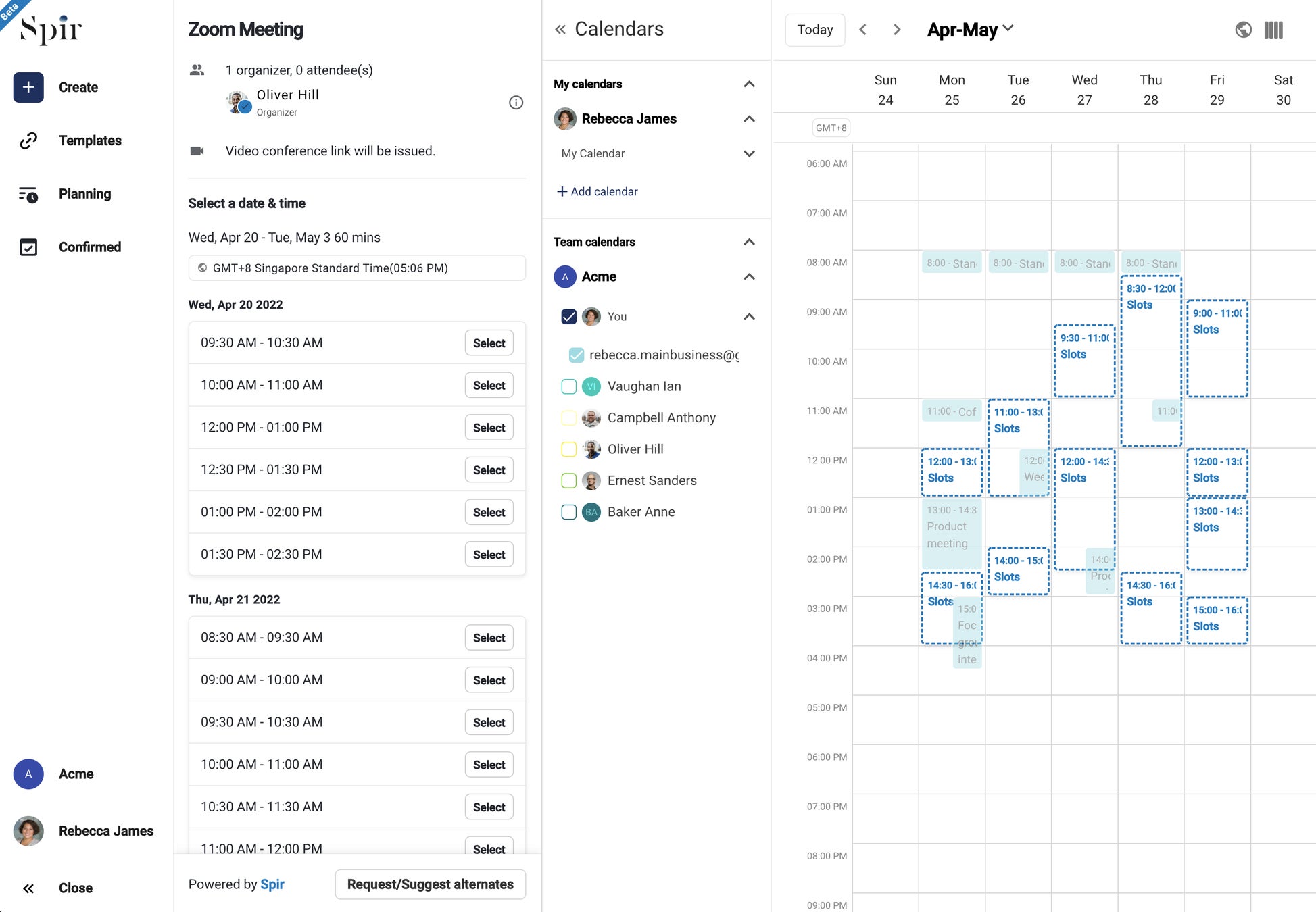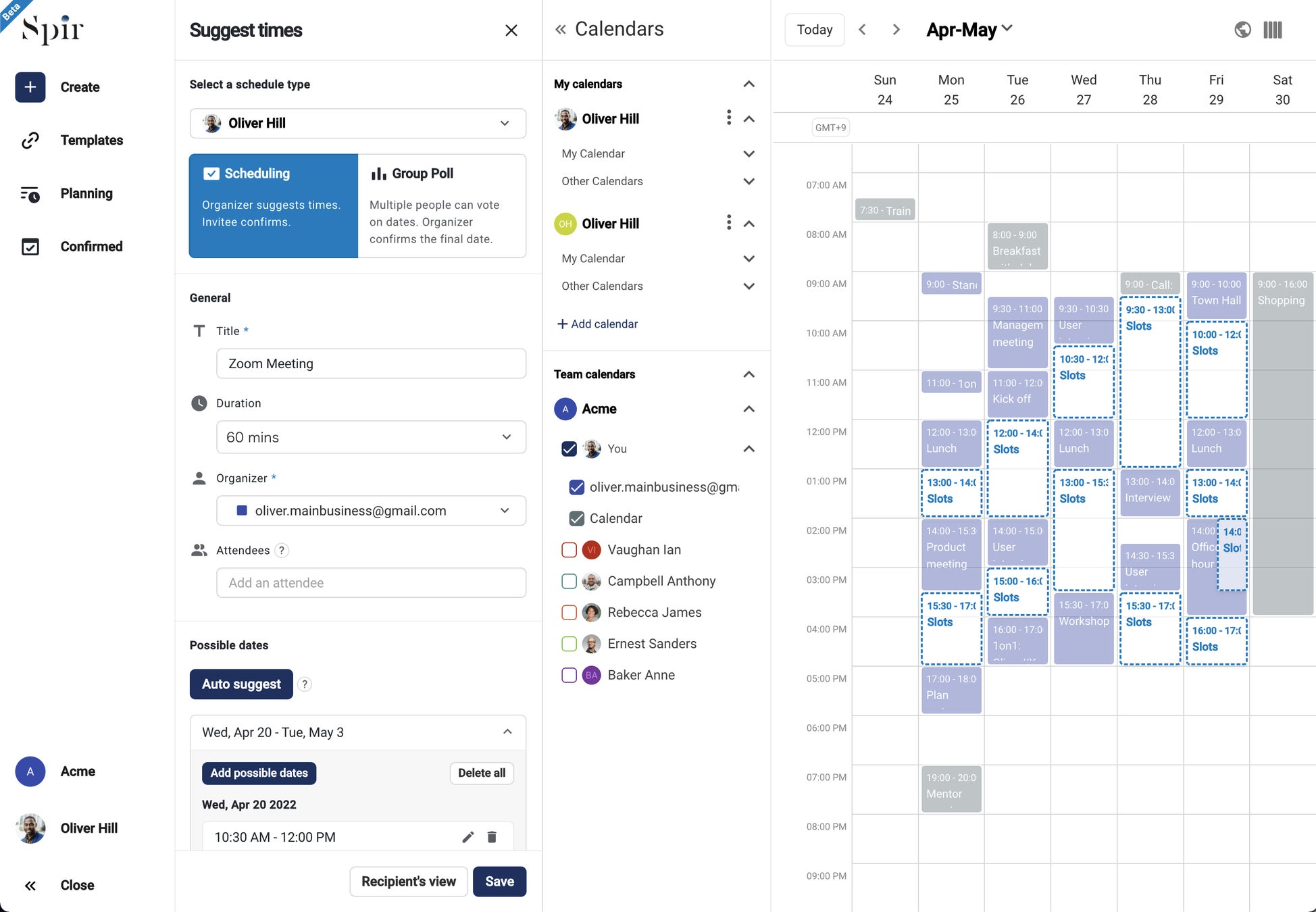 Spirは「相手も、自分も、思いどおりの調整を。」というコンセプトのもと、予定管理から日程調整まで、戦略的にタイムマネジメントができるビジネスカレンダーです。