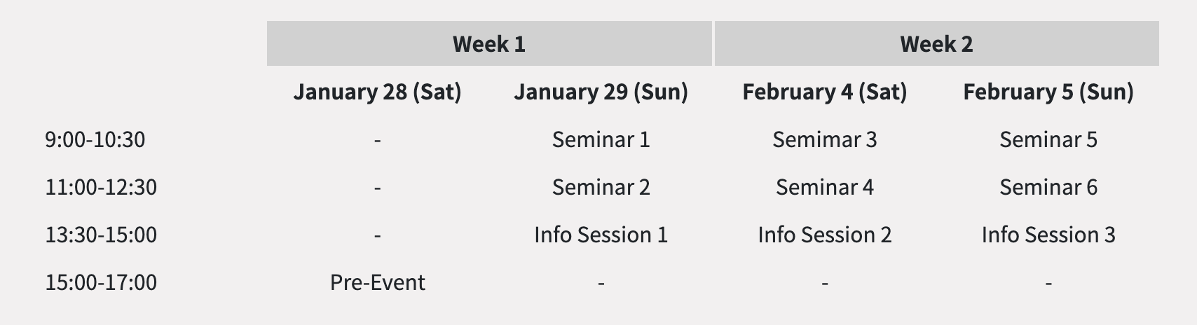 ・開催時間:セミナーセッション9:00~10:30、11:00~12:30/ Info Session 13:30~15:00