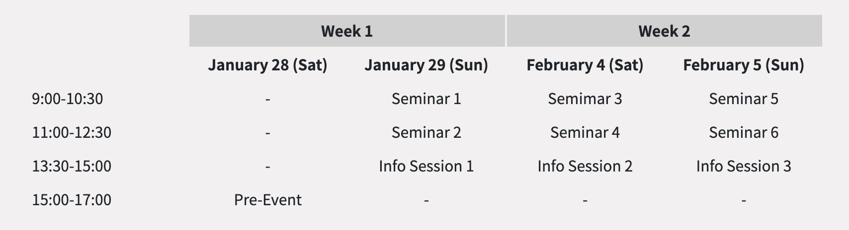 ・参加費:無料 ※セミナーは原則英語で、バイリンガルの学生がサポート参加します。また、Info Sessionは日本語のみを予定しています。