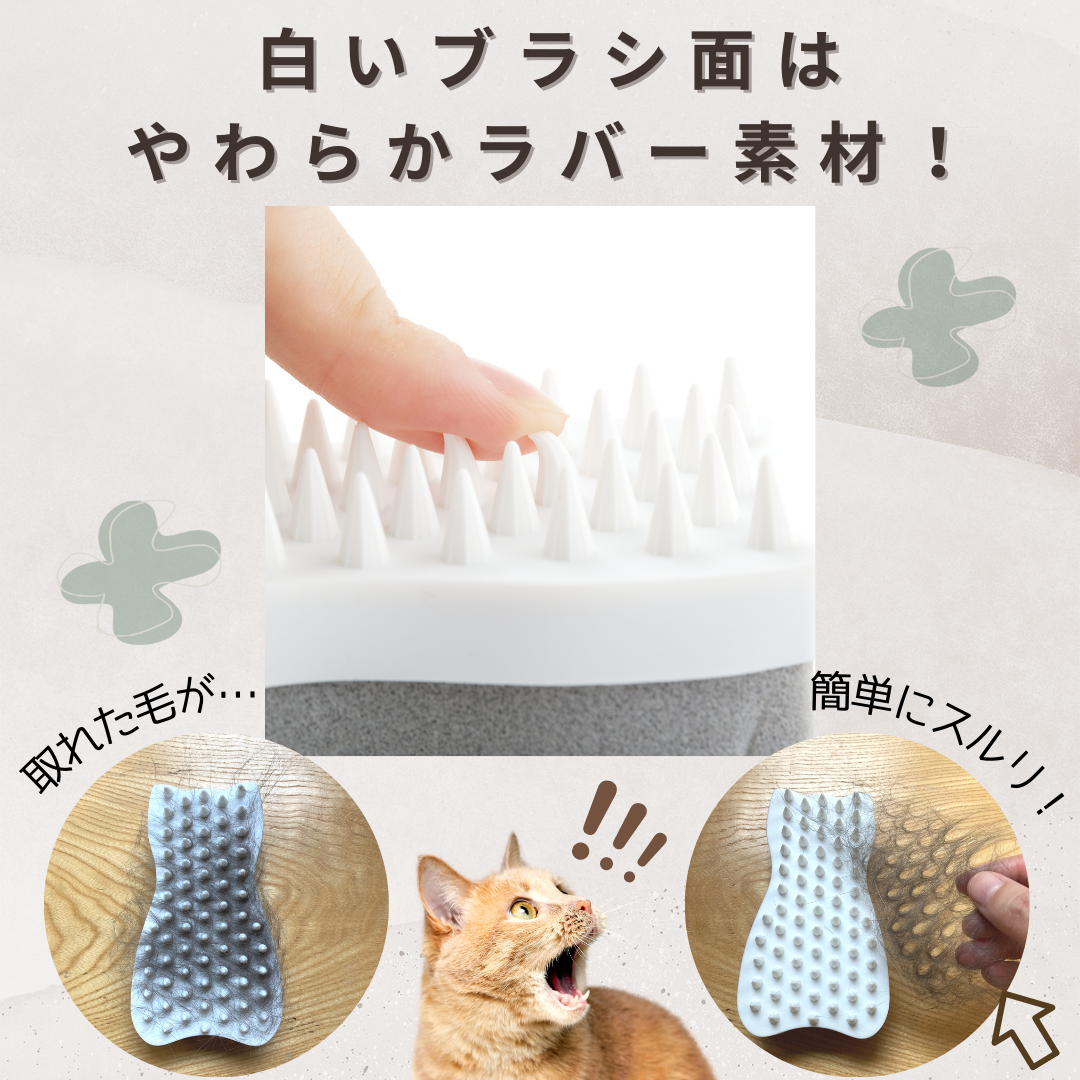 使い方はとっても簡単!白い凸凹のブラシ面は「ブラッシング」と「マッサージ」に。毛流れに沿ってやさしく撫でるだけで余分な毛がごっそり! やわらかなラバー素材のため、皮膚を傷つける心配もありません。