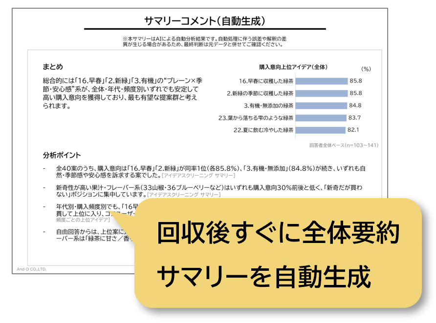 「どの案が総合的によいですか?」「ターゲット層での評価は?」「要点を3行でまとめて」といった質問に対し、レポート内容を参照して回答します。