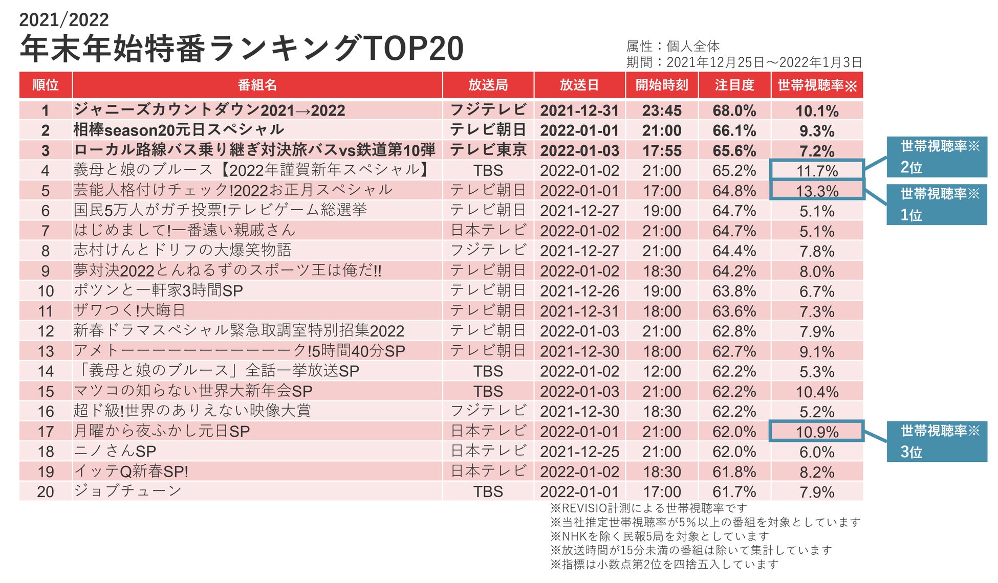ご家庭に人体認識技術を搭載した機器を設置し、テレビスクリーンの「視られている量」を測るREVISIO株式会社(2022/10/1にTVISION INSIGHTSから社名を変更、所在地 :東京都千代田区、代表取締役社長 郡谷 康士、以下REVISIO)は、注目度※を使って、2021年2022年の年末年始に集中して見られた番組は何だったのかを振り返りました。