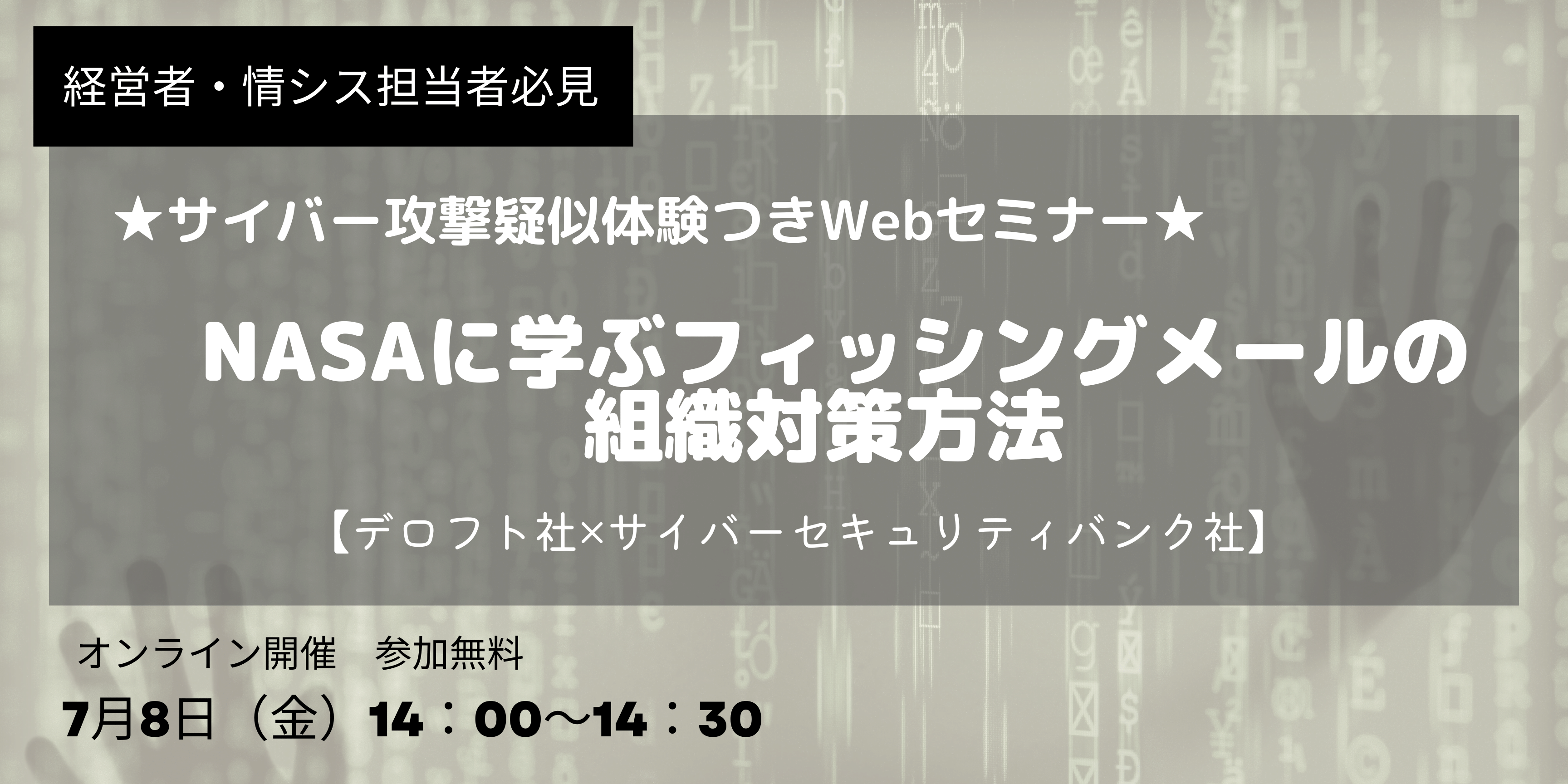 WEBセミナー【★サイバー攻撃疑似体験★NASAに学ぶフィッシングメールの組織対策方法】を株式会社サイバーセキュリティバンクと株式会社デロフトが共催!