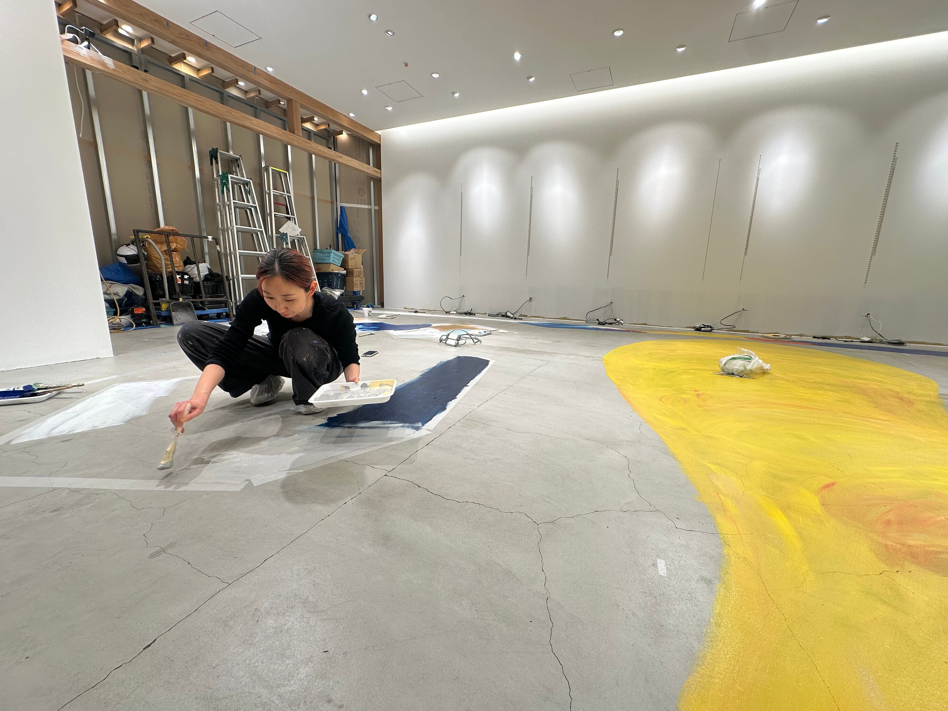 現在、ソラマチ4階のオープン予定地を彩っているのは、アーティスト細谷みづき氏による巨大な手描きアートです。墨田の空に上がる花火や、優雅に泳ぐ金魚など、地域の活気をダイナミックに表現しています。